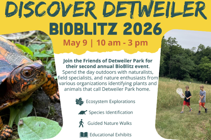 Join the Friends of Detweiler Park for their second annual BioBlitz event! Spend the day outdoors with naturalists, field specialists, and nature enthusiasts from various organizations identifying plants and animals that call Detweiler Park home. At 411 acres, Detweiler Park offers a variety of habitats for ecosystem explorations including fields, meadows, forests, and streams. iNaturalist, a free app, along with other methods will be used to help participants identify their discoveries. Visit www.detweilerpark.org/events to learn more about the BioBlitz.