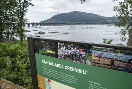 The trail is a 20-mile loop through and around Harrisburg. The Greenbelt passes along the Susquehanna River through Riverfront Park through wooded areas, urban offices, residential areas, and scenic parks, including Reservoir Park, Wildwood Park, and Fort Hunter Park. Parts of the trail share the road, but most of the loop is on dedicated paths. Most of the trail is paved but portions are gravel or crushed stone.